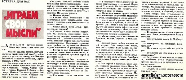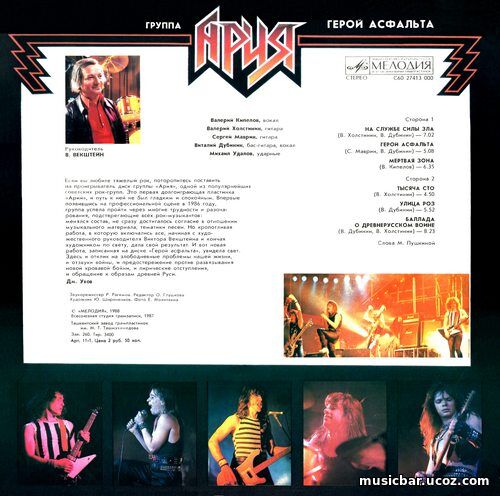 Страна: СССР Носитель: Audio LP Год выпуска: 1988 Лэйбл: «МЕЛОДИЯ» Порядковый номер: С60 27413 000, С60 27414 000 Матричный номер: С 60 - 27413/3-1, С 60 - 27414/3-1 Жанр: хэви-металл Формат: MP3 320 kbps – очищено от шумов и тресков Аудиокодек: FLAC (*.flac) – копия записи с пластинки Тип рипа: image+.cue Битрейт аудио: 24 bit 44000 Hz lossless Размер файла: MP3 – 334 Мб, FLAC – 651 Мб Продолжительность: 37:50 Треклист: Сторона 1 01. На службе силы зла (В. Холстинин, В. Дубинин – М. Пушкина) (7.02) 02. Герой асфальта (С. Маврин, В. Дубинин – М. Пушкина) (5.08) 03. Мёртвая зона (В. Кипелов – М. Пушкина) (6.35) Сторона 2 04. 1100 (В. Холстинин – М. Пушкина) (4.50) 05. Улица роз (В. Дубинин – М. Пушкина) (5.52) 06. Баллада о древнерусском воине (В. Дубинин, В. Холстинин – М. Пушкина) (8.23) Слова Маргариты Пушкиной Звукорежиссёр Р. Рагимов. Редактор О. Глушкова Художник Ю. Широченков. Фото Е. Молитвина © «МЕЛОДИЯ, 1988 Всесоюзная студия грамзаписи. Запись 1987г. Ташкентский завод грампластинок им. М. Т. Ташмухамедова, 1988 Зак. 260. Тираж 3400 Арт. 11-1. Цена 2 руб. 50 коп. Оцифровка Геннадия Горбунова | |