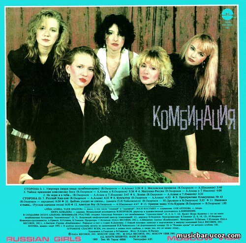 Комбинация – Московская прописка, 1991 LP «Московская прописка» - третий студийный альбом советской и российской поп-группы «Комбинация», выпущенный в 1991 году на лейбле Gala Records. В «Звуковой дорожке МК» на основе данных о продажах этот релиз достиг 3-й строчки ежемесячного хит-парада грампластинок, а по опросу читателей вошёл в десятку лучших альбомов 1991 года. Наиболее успешными в чартах синглов в поддержку лонгплея оказались композиции «American Boy» и «Бухгалтер». На обе песни также были сняты видеоклипы. Альбом «Московская прописка» стал последним, записанным «Комбинацией» при участии вокалистки Алёны Апиной, в том же 1991 году покинувшей группу в целях продолжения сольной карьеры. Выпустив полноформатные альбомы: «Ход конём» (1988) – в магнитоальбомном варианте и «Русские девочки» (1990) – в магнитоальбомном формате и на грампластинках, в 1991 году группа «Комбинация» представила свой третий лонгплей – «Московская прописка». Материал записывался в период с января по март 1991 года в Москве на Студии Gala Records. В записи альбома принимали участие вокалистки Алёна Апина и Татьяна Иванова, в том числе «оперный» и «народный» вокалы; Зося Костыко – клавишные; Оля Ахунова – гитара; Нюра Ковалева – ударные; гитарист Александр Венгеров; басист Игорь Яковенко. Музыкальный руководитель - Виталий Окороков, Директор и художественный руководитель Александр Шишинин. Вначале альбом был выпущен Студией звукозаписи «ЗВУК» в магнитоальбомном формате, а позже на виниле, под лейблом Gala Records Inc. Трек лист магнитоальбома состоит из 11 композиций: «Вступление к альбому»», «Московская прописка», вокальная вставка «Комбинация», «Матушка-Россия», «Не верю я в тебя…» (русскоязычный вариант), «Лёшка», «Вишнёвая девятка», «Русский хип-хоп», «Бухгалтер», «Любовь уходит не спеша…» и «American Boy», Магнитоальбом группы Комбинация - Московская прописка, 1991 можно скачать здесь в MP3. rar а виниловый альбом состоит из композиций: «Увертюра», «Московская прописка», «Тайное признание комсомолки Зоси», «Матушка-Россия», «Не верю я в тебя…» (англоязычный вариант), «Лёшка», «Русский хип-хоп», «Бухгалтер», «Предчувствие коммунизма № 43», «Любовь уходит не спеша…», вокальная вставка «Напилася я пьяна», «American Boy» и «Призрак замка Усть-Курдюм». С выходом «Московской прописки», к уже популярным работам коллектива «Russian Girls», «Не забывай» и «Белый вечер», добавились «American Boy», «Матушка-Россия», «Любовь уходит, не спеша…» и «Бухгалтер». При этом последняя композиция была стилизована под шансон и отличалась от привычного репертуара ансамбля настолько, что по словам сооснователя группы Виталия Окорокова, данный трек сначала даже не хотели включать в альбом. Музыку альбома написал сам Окороков, а тексты – Александр Шишинин, Алёна Апина, Татьяна Иванова, Виталий Окороков, Юрий Дружков. Печально, что эта работа была последней для Алёны Апиной в «Комбинации». В 1991 году она покинула группу, начав успешную сольную карьеру с песни «Ксюша». По этой причине работу над лонгплеем пришлось завершать уже без неё, и, например, англоязычный трек «Не верю я в тебя…», в итоге, звучал лишь с вокальной партией Татьяны Ивановой. Однако, в то время как диск стал прощальным для Апиной, для издававшей его фирмы Gala Records Inc. он послужил, напротив, своего рода дебютом. Прежде успешно реализуя магнитозаписи, компания решила 